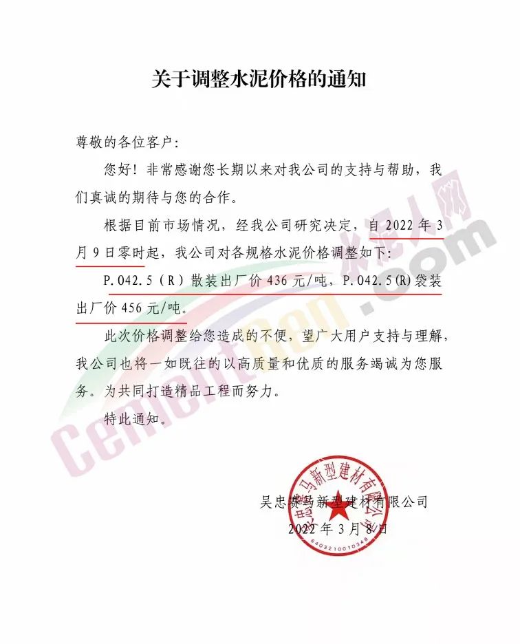 吳忠賽馬新型建材有限公司通知,根據目前市場情況,經公司研究決定,自3月9日零時起,公司對各規格水泥價格進行調整。其中P.O42.5(R)散裝出廠價436元/噸,包裝出廠價456元/噸。