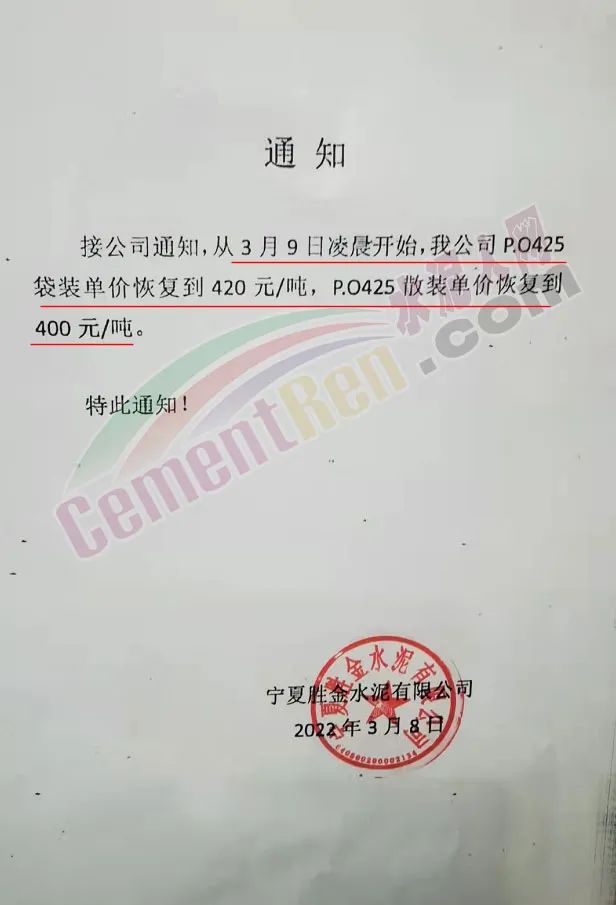 寧夏勝金水泥有限公司通知,從3月9日凌晨開始,公司P.O42.5袋裝水泥恢復到420元/噸,P.O42.5散裝水泥恢復到400元/噸。