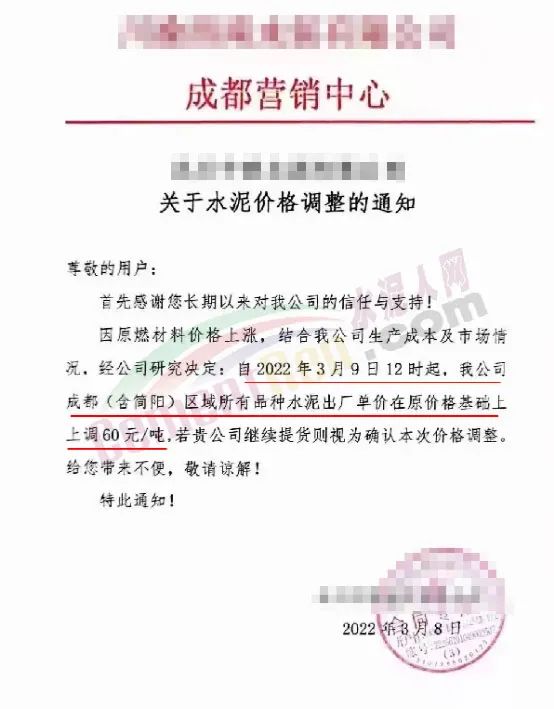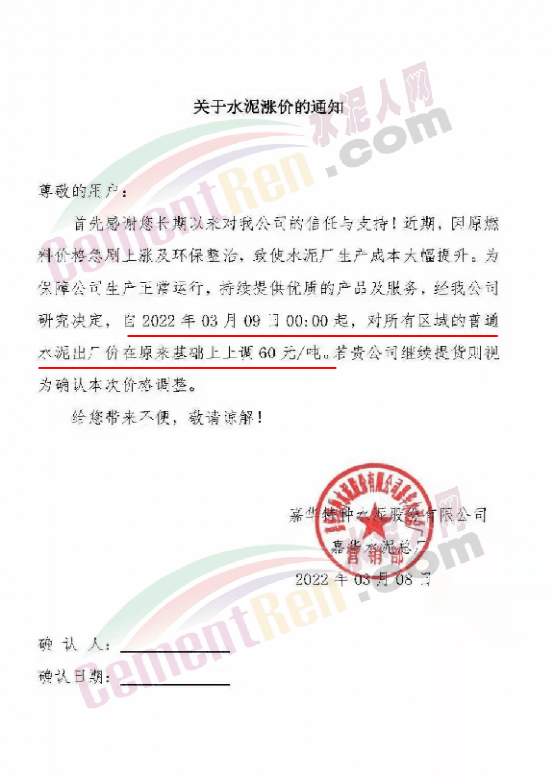 ?嘉華特種水泥通知稱,因原燃料價格急劇上漲及環保整治,致使水泥廠生產成本大幅提升。為保障公司生產正常支行,持續提供優質的產品及服務,經公司研究決定,自3月9日0時起,對所有區域的普遍水你先出廠價在原基礎上上調60元/噸。