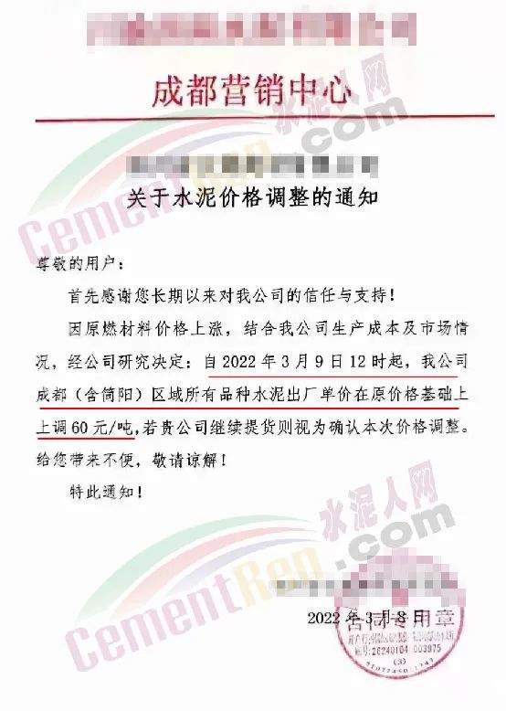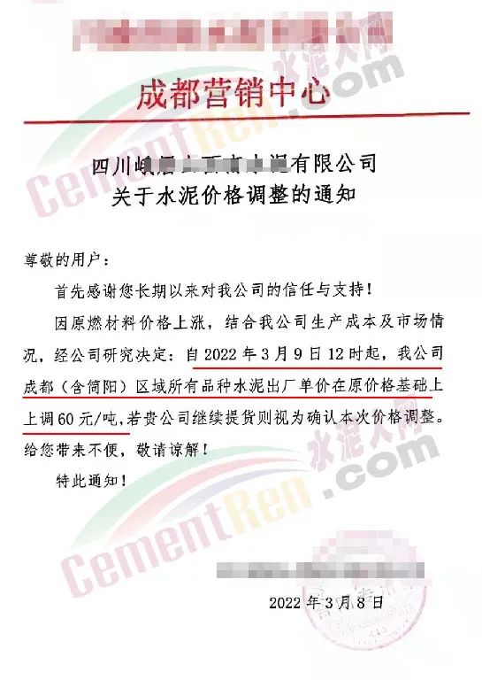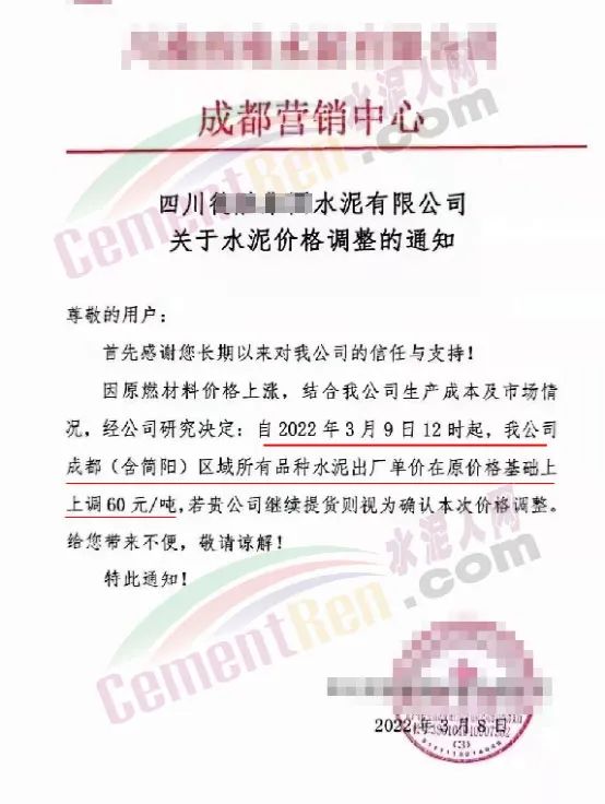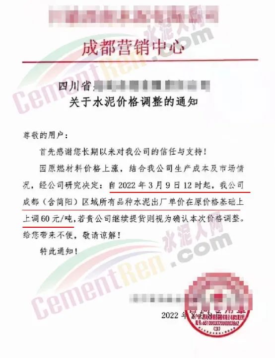 同日,四川成都區域主要品牌企業通知因原燃材料價格上漲,結合公司生產成本及市場情況,經研究決定自3月9日12時上調成都(含簡陽)區域所有品種水泥出廠價60元/噸。
