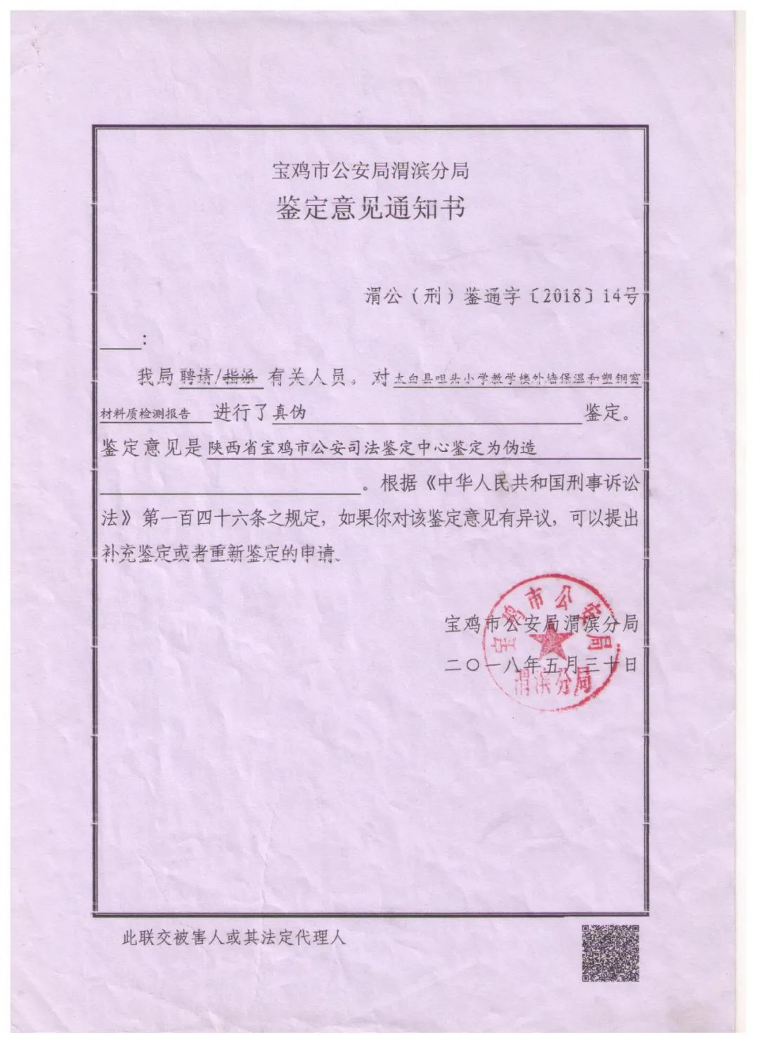 根據(jù)2018年5月寶雞市公安局渭濱分局出具的鑒定意見通知書,公安機(jī)關(guān)聘請(qǐng)有關(guān)人員對(duì)太白縣咀頭小學(xué)教學(xué)樓外墻保溫和塑鋼窗材料質(zhì)檢測(cè)報(bào)告進(jìn)行了真?zhèn)舞b定,陜西省寶雞市公安司法鑒定中心鑒定為偽造。