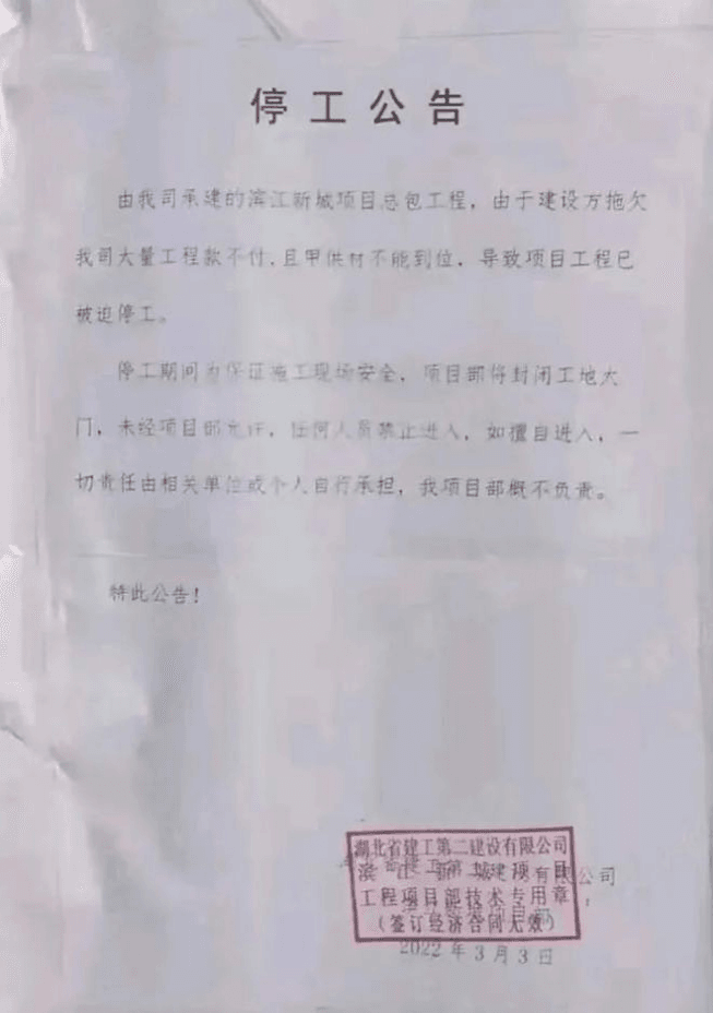 佳兆業(yè)濱江新城項(xiàng)目總包湖北省建工第二建設(shè)有限公司,發(fā)布停工公告稱,由于建設(shè)方拖欠該公司大量工程款不付,且甲供材(簡(jiǎn)單來(lái)說(shuō)就是由甲方提供的材料)不能到位,導(dǎo)致項(xiàng)目工程已被迫停工。停工期間,項(xiàng)目部將封閉工地大門。