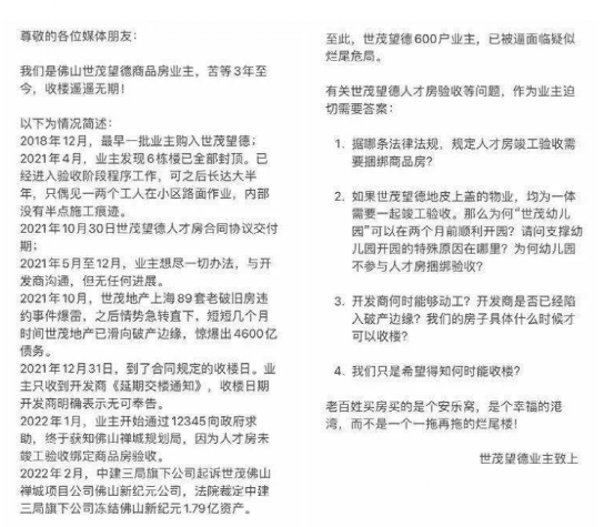 廣東佛山禪城600多戶業(yè)主,因開發(fā)商延期交樓,走上了集體維權(quán)道路,涉事樓盤是世茂望德。該項(xiàng)目于2018年開盤,2020年售完,主打毛坯復(fù)式產(chǎn)品,合同約定在2021年12月31日交樓。在本該收樓的日子,業(yè)主卻等來(lái)了開發(fā)商的 《延期交樓通知》,且未告知具體延期日期。