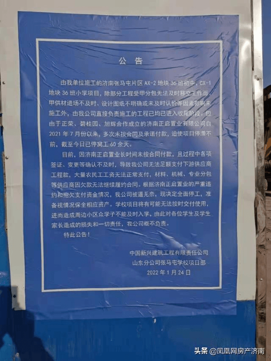 中國(guó)新興建筑工程有限責(zé)任公司發(fā)布公告稱,公司施工的山東濟(jì)南張馬屯片區(qū)AX-2地塊36班初中、CX-1地塊36班小學(xué)項(xiàng)目,由于正榮、碧桂園、旭輝合作成立的濟(jì)南正啟置業(yè)有限公司自2021年7月份以來(lái),多次未按合同及承諾付款,迫使項(xiàng)目停滯不前,施工方現(xiàn)決定全面停工。