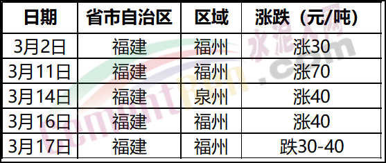 最具戲劇性的是前一天剛剛上調(diào)40元/噸的福建福州、泉州區(qū)域,17日通知水泥價(jià)格跌30-40元/噸,企業(yè)解釋稱,市場(chǎng)需求表現(xiàn)不佳,企業(yè)間競(jìng)爭(zhēng)激勵(lì),漲價(jià)無(wú)法落實(shí)。