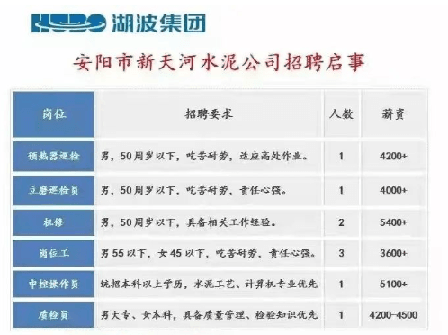 河南湖波集團(tuán)安陽(yáng)市新天河水泥招聘預(yù)熱器巡檢、立磨巡檢、機(jī)修工、崗位工、中控員、質(zhì)檢員等,薪資在4000-5400元/月。