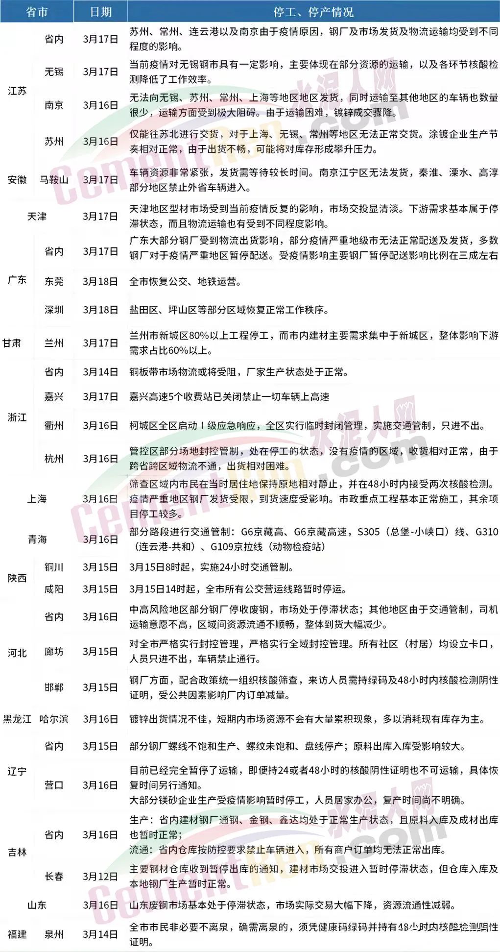 1 江蘇省內蘇州、常州、連云港以及南京由于疫情原因,鋼廠及市場發貨及物流運輸均受到不同程度的影響。