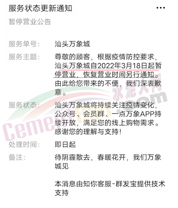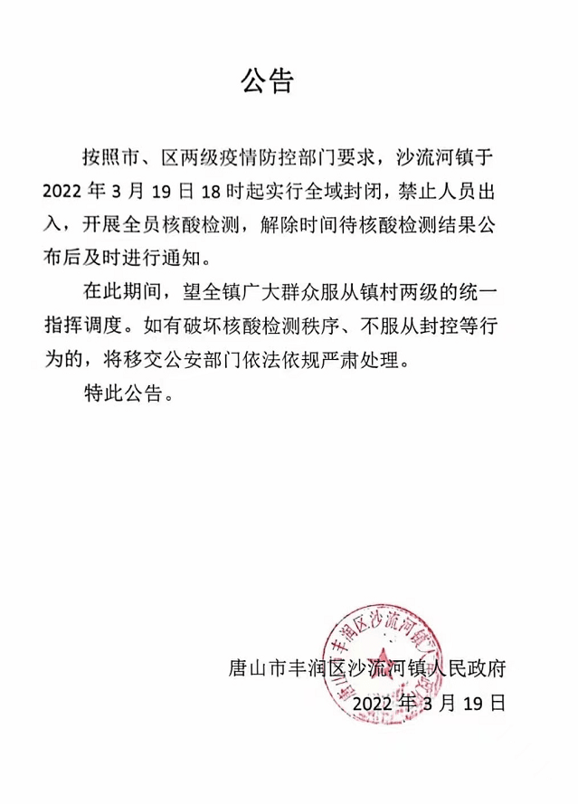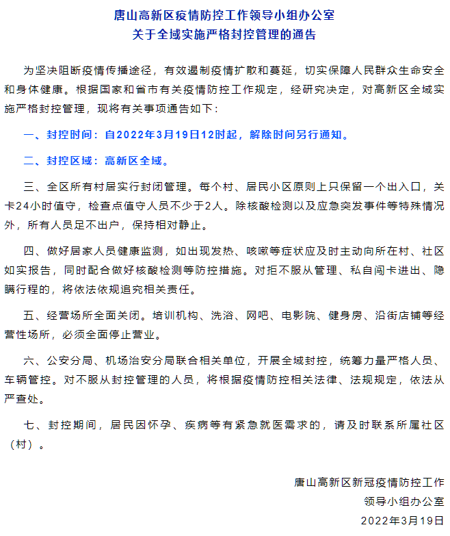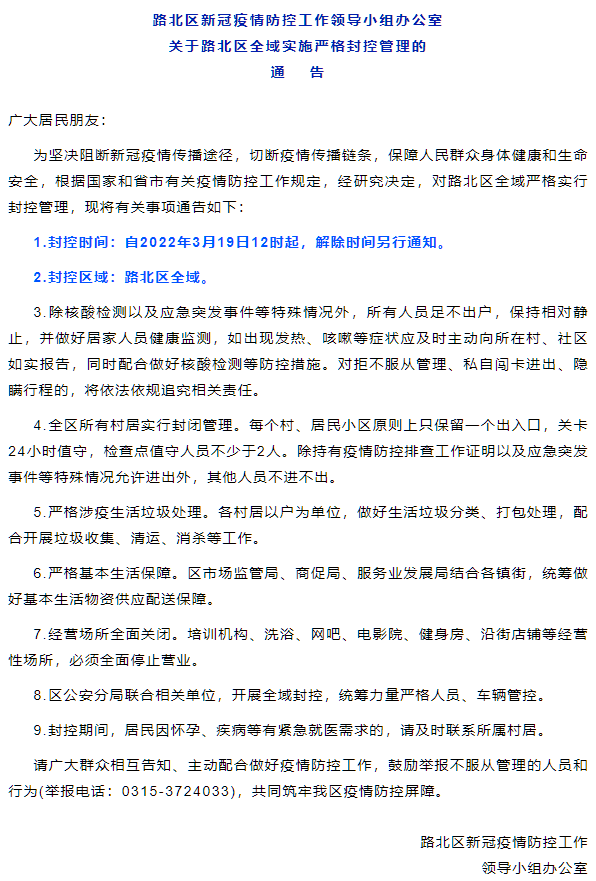 水泥重鎮唐山市多個區縣通知全域實施嚴格封控管理。