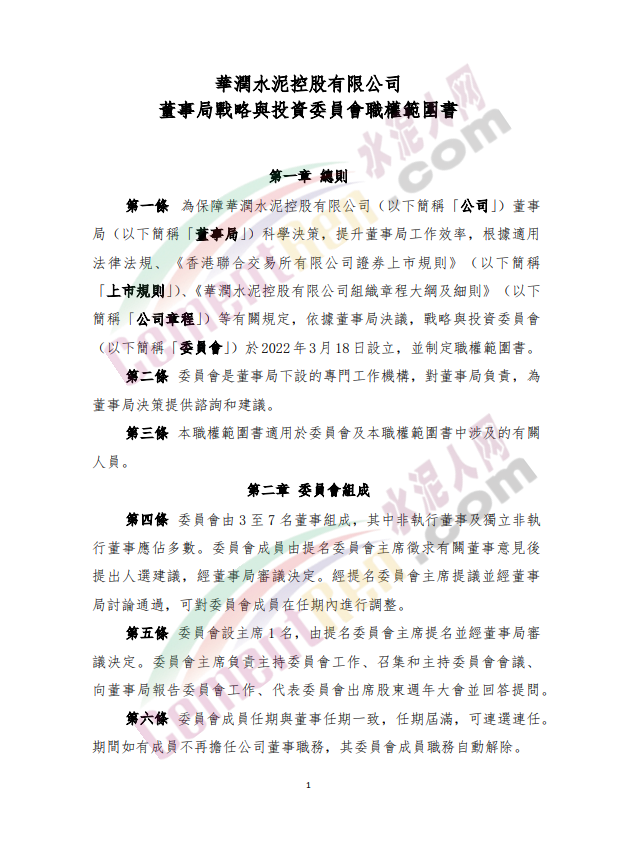 華潤水泥控股公布,自2022年3月18日起,董事局成立戰略與投資委員會,撤銷執行委員會,薪酬委員會更名為薪酬與考核委員會,企業管治委員會更名為風險與合規委員會。