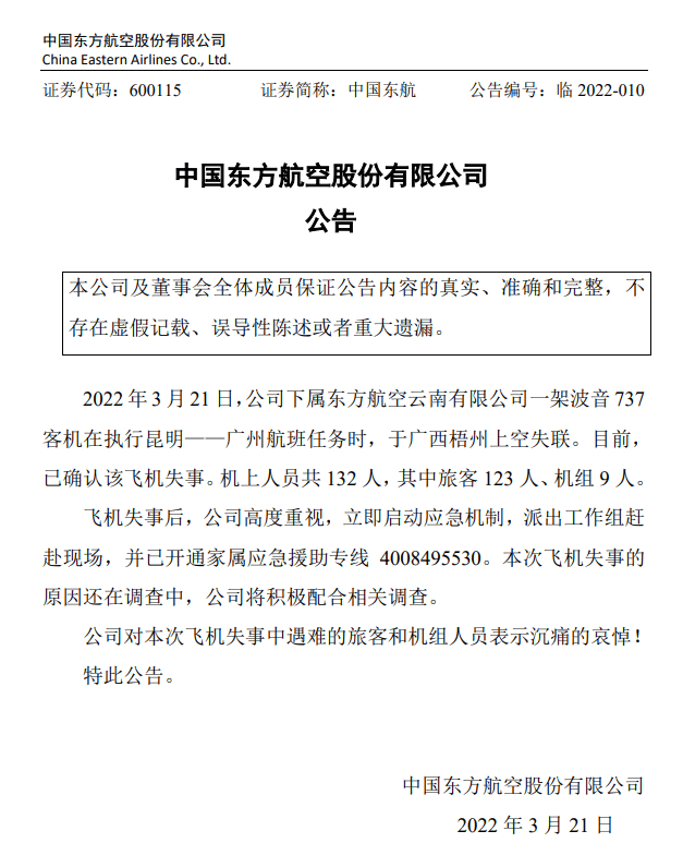 中國東航3月21日晚間公告,公司下屬東方航空云南有限公司一架波音737客機在執(zhí)行昆明——廣州航班任務時,于廣西梧州上空失聯(lián)。目前,已確認該飛機失事。機上人員共132人,其中旅客123人、機組9人。