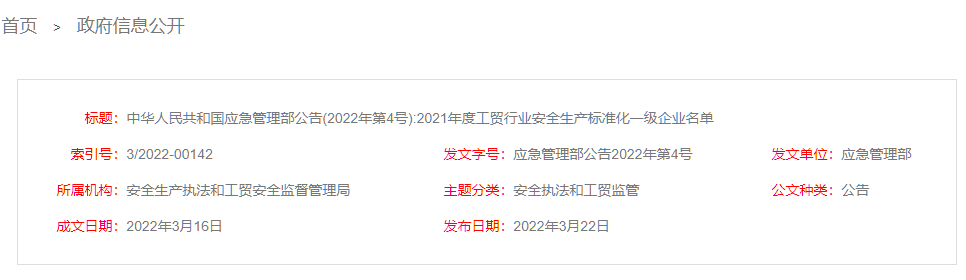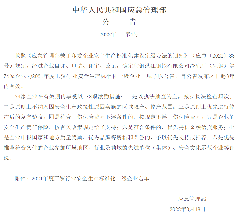 3月22日,應(yīng)急管理部發(fā)布2022年第4號(hào)公告。公告稱,按照《應(yīng)急管理部關(guān)于印發(fā)企業(yè)安全生產(chǎn)標(biāo)準(zhǔn)化建設(shè)定級(jí)辦法的通知》(應(yīng)急〔2021〕83號(hào))規(guī)定,經(jīng)過企業(yè)自評(píng)、申請(qǐng)、評(píng)審、公示,確定寶鋼湛江鋼鐵有限公司冷軋廠(軋鋼)等74家企業(yè)為2021年度工貿(mào)行業(yè)安全生產(chǎn)標(biāo)準(zhǔn)化一級(jí)企業(yè),并予以公告,自公告發(fā)布之日起3年內(nèi)有效。