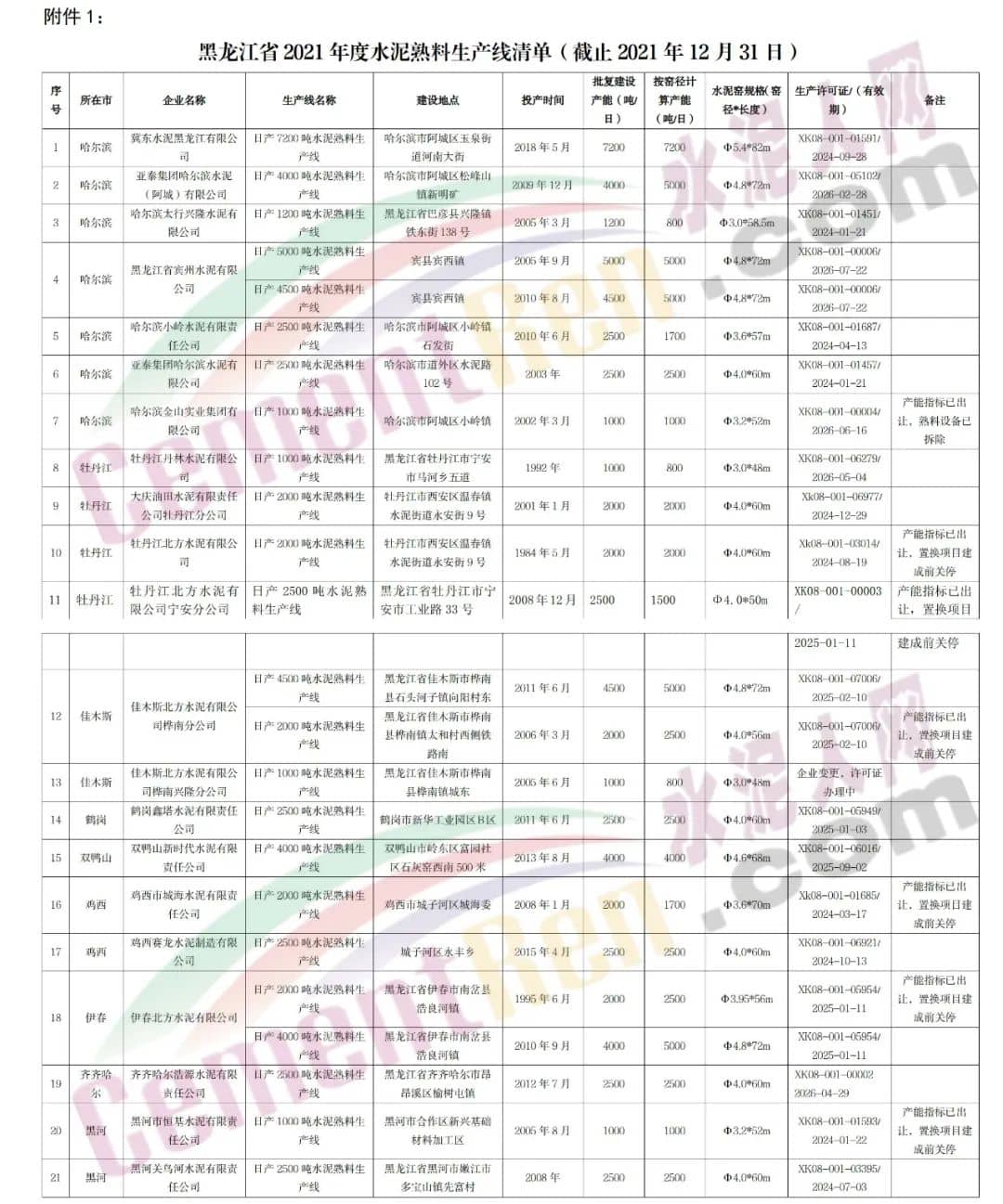 附件:1.黑龍江省2021年度水泥熟料生產線清單