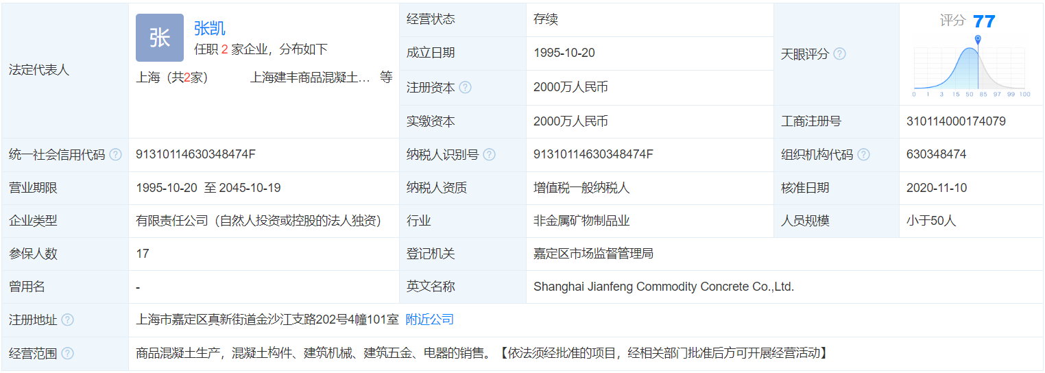 據天眼查查詢結果顯示,上海建豐商品混凝土有限公司成立于1995年,注冊資本2000萬人民幣,是上海齊信混凝土制品有限公司的子公司,主要經營范圍為商品混凝土生產,混凝土構件、建筑機械、建筑五金、電器的銷售。