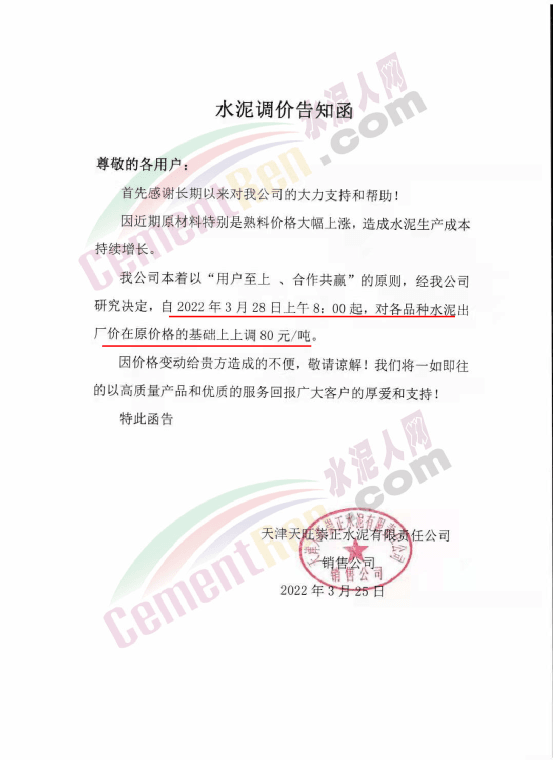 天津天旺崇正水泥有限責任公司銷售公司水泥調價告知函稱,因近期原材料特別是熟料價格大幅上漲,造成水泥生產成本持續增長,經公司研究決定自3月28日上午8時起,對各品種水泥出廠價上調80元/噸。