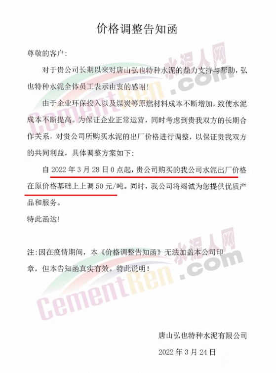唐山弘也特種水泥通知自3月28日0時起,水泥價格上調50元/噸。