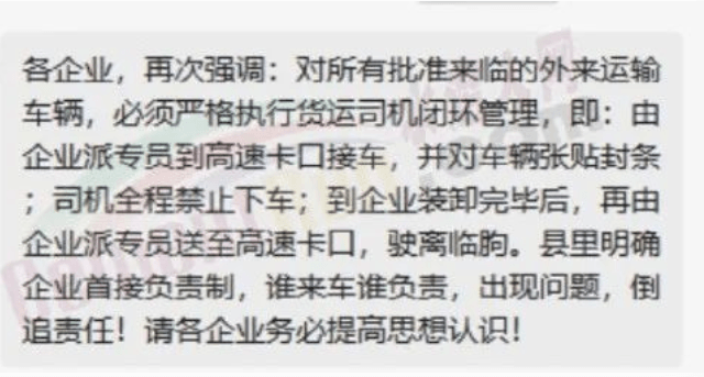 臨朐企業收到通知強調,對所有批準來臨的外來運輸車輛,必須嚴格執行貨運司機閉環管理,即:由企業派專員到高速卡口接車,并對車輛張貼封條;司機全程禁止下車;到企業裝卸完畢后,再由企業派專員送至高速卡口,駛離臨朐。縣里明確企業首接負責制,誰來車誰負責,出現問題,倒追責任!