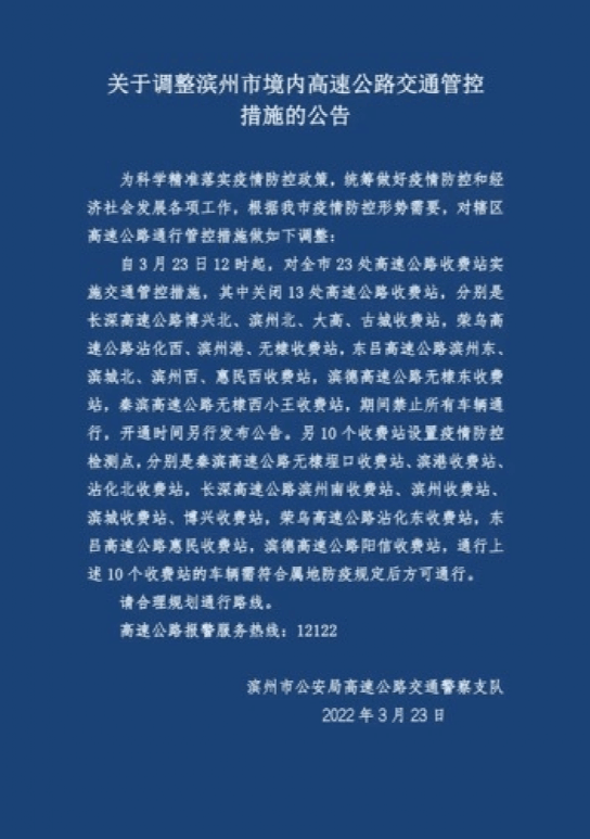 濱州市公安局高速交警支隊通知,自3月23日12時起,對全市23處高速公路收費站實施交通管控措施,其中關閉13 處高速公路收費站,開通時間另行發布公告。另10個收費站設置疫情防控檢測點,車輛需符合屬地防疫規定后方可通行。