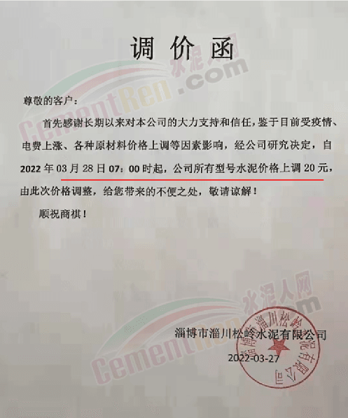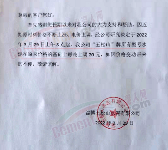 淄博市淄川松嶺水泥有限公司通知,鑒于目前受疫情、電費上漲,各種原材料價格上調等因素影響,經公司研究決定,自3月28日7時起,公司所有型號水泥價格上調20元/噸。