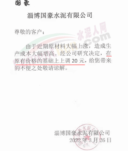 淄博國豪水泥有限公司通知,由于近期原材料大幅上漲,造成生產成本大幅增高,經公司研究決定,在原有價格基礎上上調20元/噸。