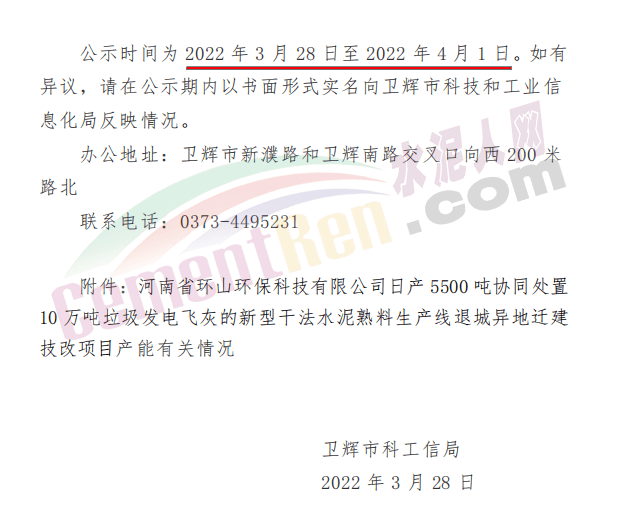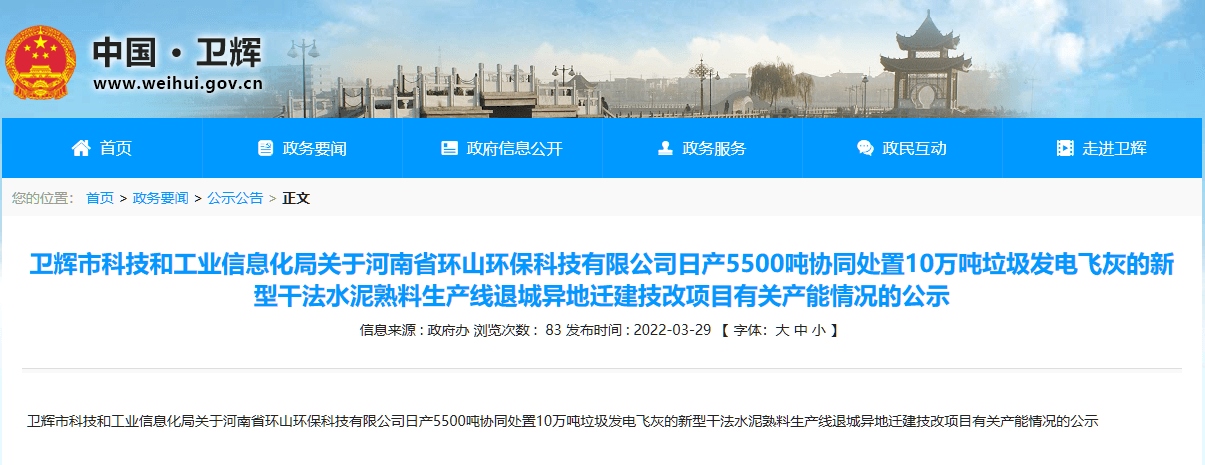日前,河南衛輝政府辦轉發衛輝市科技和工業信息化局《關于河南省環山環保科技有限公司日產5500噸協同處置10萬噸垃圾發電飛灰的新型干法水泥熟料生產線退城異地遷建技改項目有關產能情況的公示 》