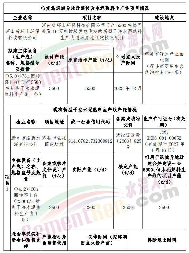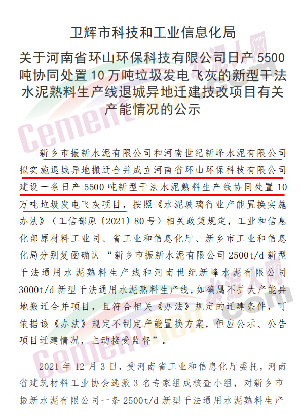 公示文件稱,新鄉市振新水泥有限公司和河南世紀新峰水泥有限公司擬實施退城異地搬遷合并成立河南省環山環保科技有限公司建設一條日產5500噸新型干法水泥熟料生產線協同處置10萬噸垃圾發電飛灰項目,按照《水泥玻璃行業產能置換實施辦法》(工信部原〔2021〕80號)相關政策規定,工業和信息化部原材料工業司、省工業和信息化廳、新鄉市工業和信息化局分別復函確認 “新鄉市振新水泥有限公司2500t/d新型干法通用水泥熟料生產線和河南世紀新峰水泥有限公司3000t/d新型干法通用水泥熟料生產線,如確屬不擴大產能異地搬遷合并項目,且符合相關《辦法》規定的遷建條件,可依據該《辦法》規定不制定產能置換方案,但應公示、公告項目遷建情況,主動接受監督”。