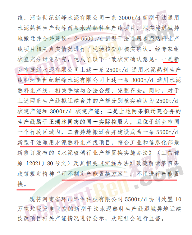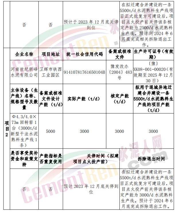 一是新鄉市振新水泥有限公司上述一條2500t/d 通用水泥熟料生產線和河南世紀新峰水泥有限公司上述一條3000t/d 通用水泥熟料生產線,相關手續均合法合規、完整齊全。同時,對于上述兩條生產線擬遷建合并的產能分別核實確認為2500t/d 核定產能和3000t/d 核定產能;