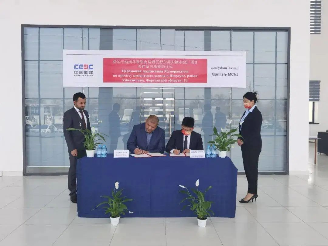 中國能建國際集團(tuán)與烏茲別克斯坦喬伊丹姆房屋建設(shè)有限公司簽署費爾干納州烏茲別克斯坦區(qū)舒爾蘇夫鎮(zhèn)水泥廠項目合作協(xié)議。費爾干納州州長參與見簽。