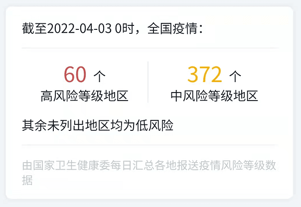 近期,全國(guó)疫情呈現(xiàn)局部高度聚集和多點(diǎn)散發(fā)態(tài)勢(shì),截止4月3日0時(shí),全國(guó)共有高風(fēng)險(xiǎn)等級(jí)地區(qū)60個(gè),中風(fēng)險(xiǎn)等級(jí)地區(qū)372個(gè)。