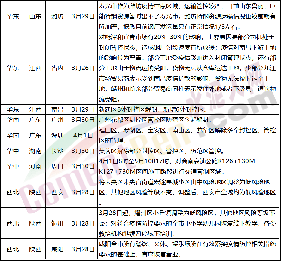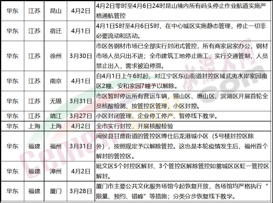 江蘇昆山4月2日零時(shí)至4月6日24時(shí)昆山境內(nèi)所有碼頭停止作業(yè)航道實(shí)施嚴(yán)格通航管控;江蘇宿遷4月1日5時(shí)至4月6日5時(shí),在中心城區(qū)實(shí)施靜態(tài)管理,停止一切非必要流動(dòng)和活動(dòng);安徽滁州自4月2日6:00起,對(duì)滁州市主城區(qū)暫時(shí)實(shí)施封控,實(shí)行靜態(tài)管理。