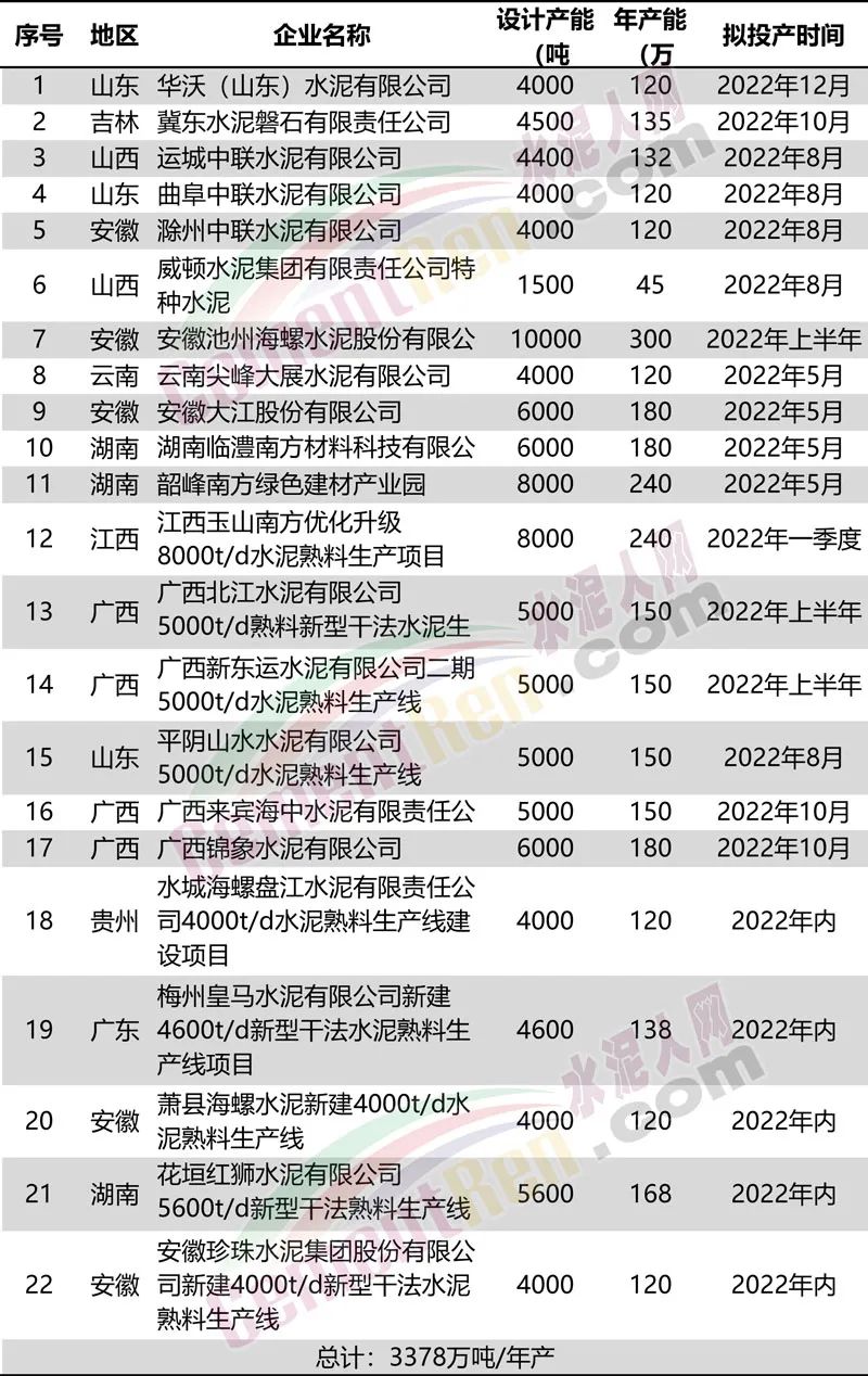 據水泥人網此前消息,2021年下半年點火投產的9個項目產能規模日產能達到52000噸,年產1560萬噸。而且全部達到綠色、智能、超低排放要求。(相關鏈接:“搶灘”!多條“智能化”水泥生產線集中點火!)