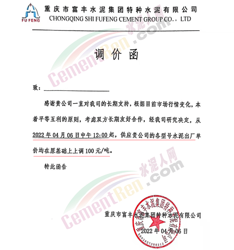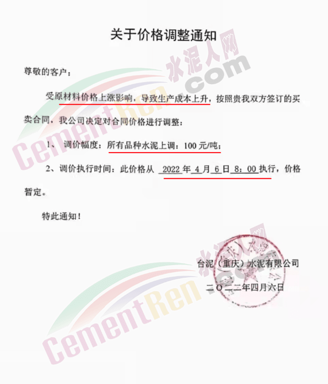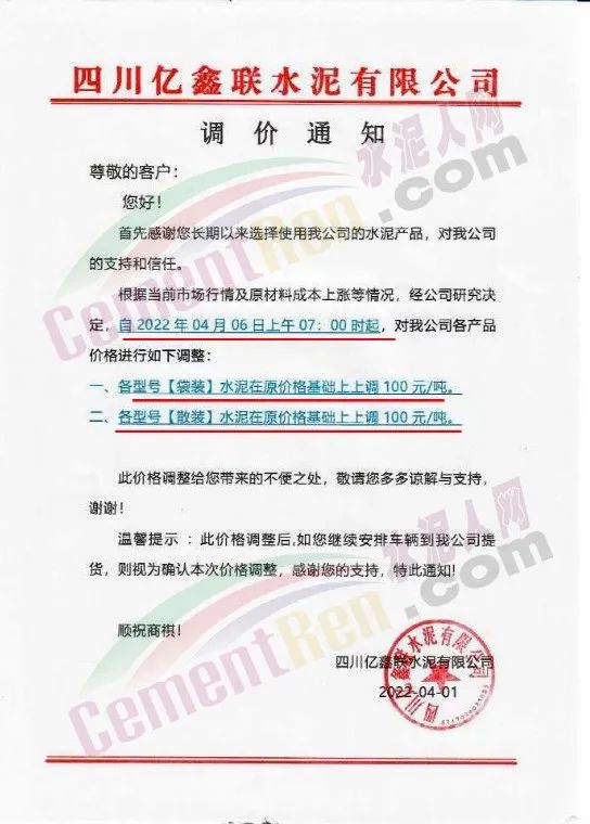四川億鑫聯(lián)水泥有限公司通知,根據(jù)當前市場行情原材料成本上漲等情況,經(jīng)公司研究決定自4月6日上午7時起,對各型號水泥在原價基礎上上調100元/噸。