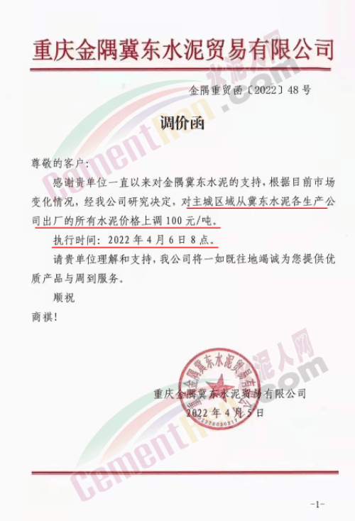 重慶淮航商貿(mào)有限公司通知,因原材料價格上漲,經(jīng)公司研究決定從4月6日8時起對重慶 、永川、江津、璧山區(qū)域的所有袋裝、散裝水泥上調80元/噸。