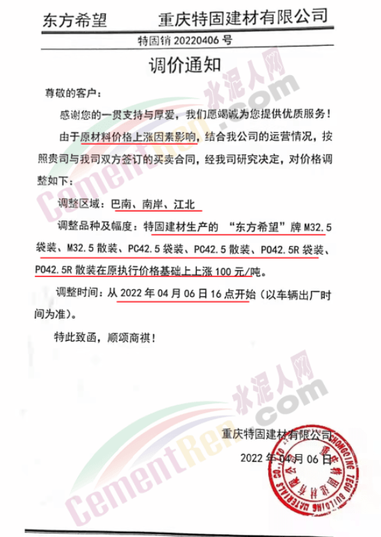 日前,川渝地區(qū)包括臺泥(重慶)、重慶金隅冀東、東方希望在內(nèi)的多家企業(yè)通知由于原材料成本增加影響,上調水泥價格100元/噸。