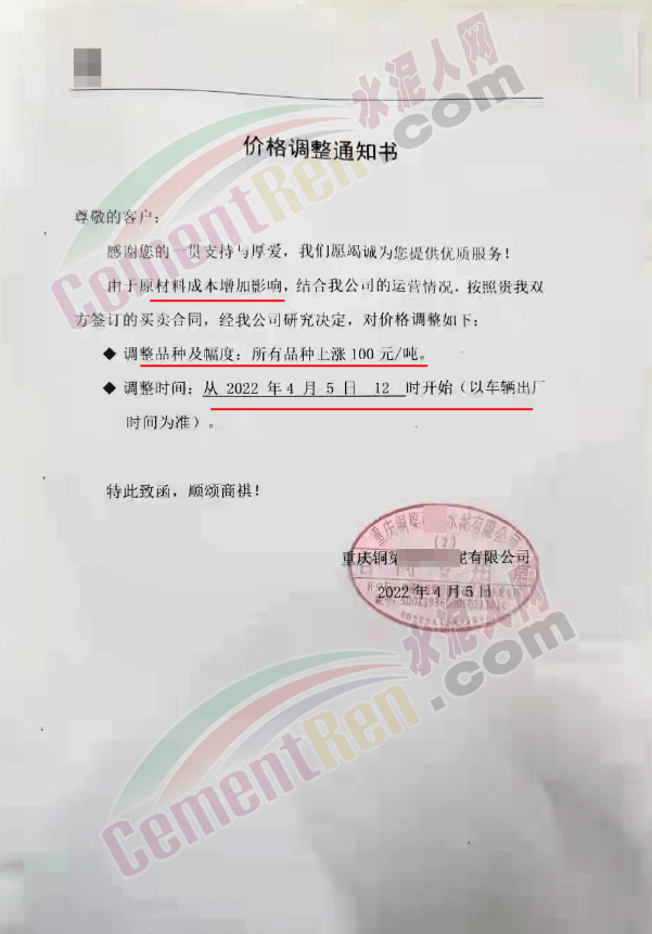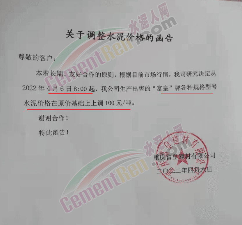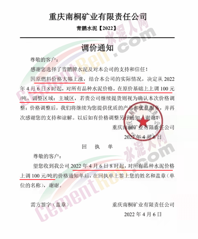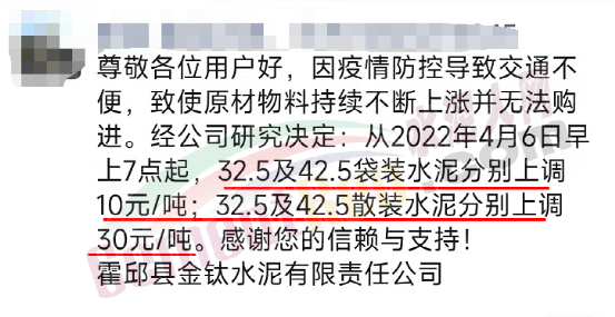 安徽六安霍邱縣金鈦水泥有限責任公司發(fā)通知稱,因疫情防控導致交通不便,致使原材物料持續(xù)不斷上漲并無法購進。經(jīng)公司研究決定從2022年4月6日早上7點起,32.5及42.5袋裝水泥分別上調10元/噸;32.5及42.5散裝水泥分別上調30元/噸。