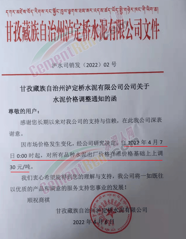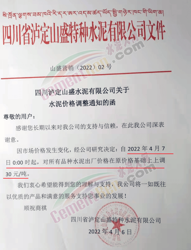 四川甘孜藏族自治州瀘定橋水泥有限公司及瀘定山盛特種水泥有限公司兩家水泥企業(yè)通知,因市場價格發(fā)生變化,經(jīng)公司研究決定上調水泥價格30元/噸。