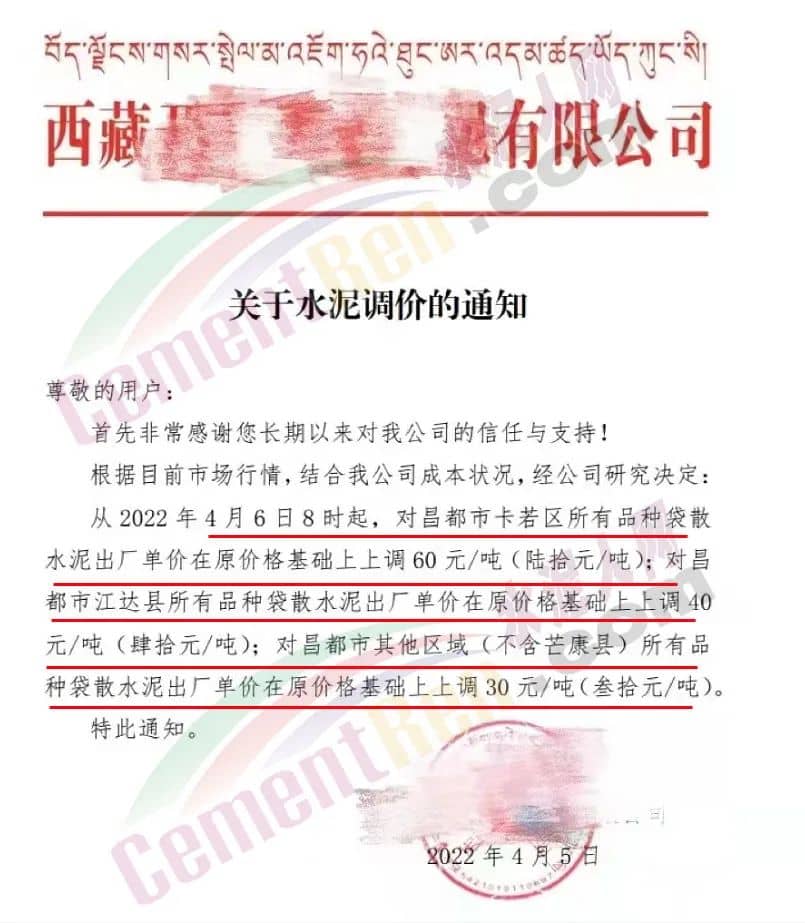 同期,西藏昌都地區(qū)主要品牌水泥通知,從4月6日早8時起,對昌都市卡若區(qū)所有品牌袋散水泥出廠單價在原價基礎上上調60元/噸。對昌都市江達縣所有品種袋散水泥出廠單價在原價基礎上上調40元/噸。對昌都市其他區(qū)域(不含芒康縣)所有品種袋散水泥出廠單價上調30元/噸。