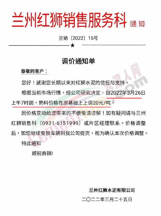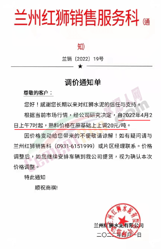 蘭州紅獅銷售服務科通知。根據(jù)當前市場行情,經(jīng)公司研究決定,自2022年4月2日上午7時起,熟料價格在原基礎上上調20元/噸。據(jù)了解,這是蘭州紅獅近一個月來的第二次熟料調價,企業(yè)還曾于3月26日上調熟料價格20元/噸,兩次調價累計上調40元/噸。
