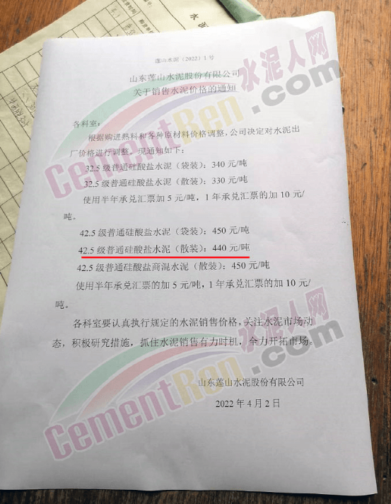 4月2日,山東蓮山水泥通知稱,根據(jù)購進熟料和各種原材料價格調整,公司決定對水泥出廠價格進行調整,調整后42.5級散裝水泥報價440元/噸,商混用散裝42.5普通硅酸鹽水泥報價450元/噸,半年承兌匯票加5元/噸,1年承兌匯票加10元/噸。