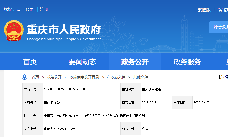 重慶市2022年市級重大建設項目