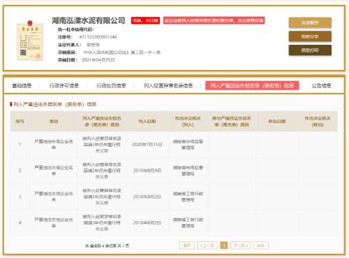 湖南泓溧水泥有限公司2018~2020年連續三年被列入嚴重違法失信企業名單 ,目前狀態為吊銷,未注銷。