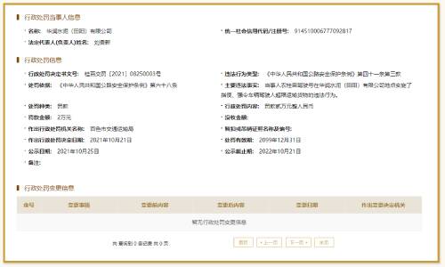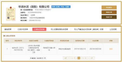 華潤水泥(田陽)有限公司在2021年10月21日被百色市交通運輸局罰款2萬元,主要違法事實為,當事人在華潤水泥(田陽)有限公司地點實施了指使、強令車輛駕駛人超限運輸貨物的違法行為。