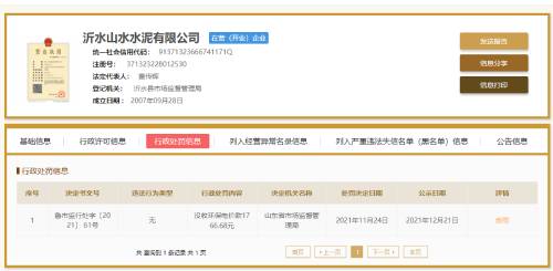 沂水山水水泥有限公司2021年11月24日被山東省市場監管局處罰。沒收環保電價款1766.68元。違法事實為當事人涉嫌存在部分燃煤發電機組污染物排放濃度小時均值超限值仍享受環保電價的價格違法行為。