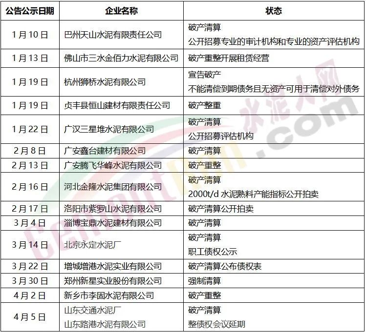 今年1~3月全國企業破產重整案件信息網公開發布了巴州天山水泥有限責任公司、佛山市三水金佰力水泥有限公司、杭州獅橋水泥有限公司、貞豐縣恒山建材有限責任公司、廣漢三星堆水泥有限公司、廣安鑫臺建材有限公司、廣安騰飛華峰水泥有限公司、河北金隆水泥集團有限公司、洛陽市紫羅山水泥有限公司、淄博寶鼎水泥建材有限公司、北京永定水泥廠、增城增港水泥實業有限公司、鄭州新星實業股份有限公司、新鄉市李固水泥有限公司、山東交通水泥廠、山東路港水泥有限公司等16家水泥企業相關的破產、破產重整、破產清算、強制破產消息。