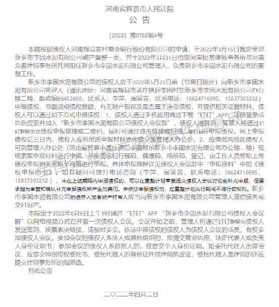4月2日河南省輝縣市人民法院公告稱,根據債權人河南輝縣農村商業銀行股份有限公司的申請,于2022年3月16日裁定受理新鄉市李固水泥有限公司破產重整一案,并于2022年3月31日指定河南銀基律師事務所與河南眾盈律師事務所共同擔任新鄉市李固水泥有限公司管理人,負責新鄉市李固水泥有限公司的重整工作。定于2022年6月6日上午9時通過“釘釘”APP“新鄉市李固水泥有限公司債權人會議群”以網絡視頻方式召開第一次債權人會議。