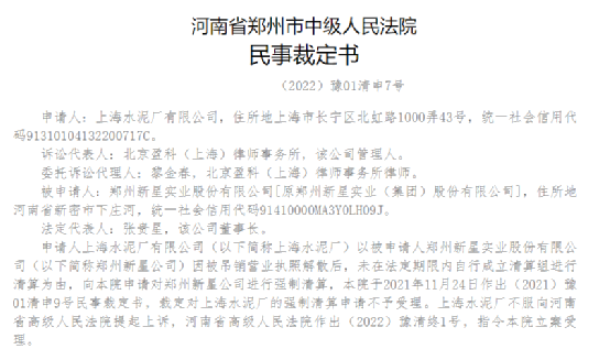 3月30日河南省鄭州市中級人民法院受理上海水泥廠有限公司對鄭州新星實業股份有限公司的強制清算申請。