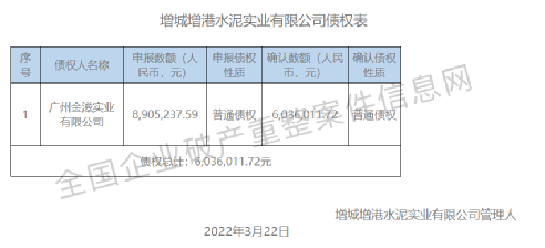 3月22日增城增港水泥實業有限公司管理人發布倒債權表顯示,企業普通權總計為6036011.72元。