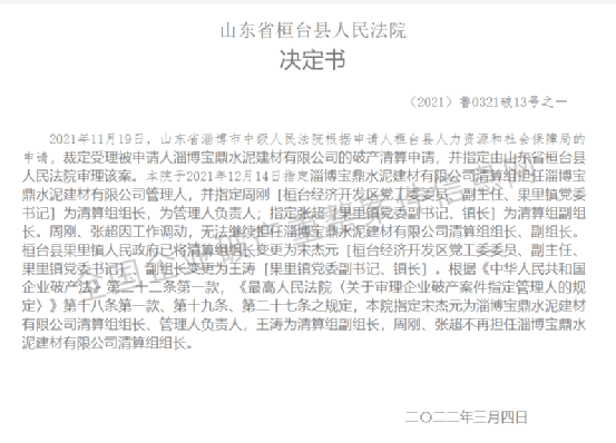 3月4日山東省恒臺縣人民法院決定書稱,2021年11月19日,山東省淄博市中級人民法院根據申請人桓臺縣人力資源和社會保障局的申請,裁定受理被申請人淄博寶鼎水泥建材有限公司的破產清算申請,并指定由山東省桓臺縣人民法院審理該案。本院于2021年12月14日指定淄博寶鼎水泥建材有限公司清算組擔任淄博寶鼎水泥建材有限公司管理人。