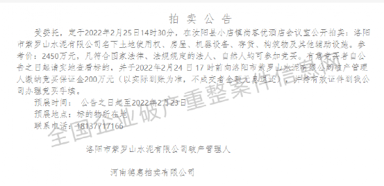 2月17日,洛陽市紫羅山水泥有限公司破產管理人聯合河南德惠拍賣有限公司發布拍賣公告稱,受委托定于2月25日公開拍賣洛陽市紫羅山水泥有限公司名下土地使用權、房屋、機器設備、存貨、構筑物等,參考價為2450萬元。