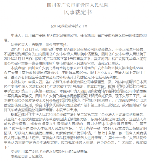 2月13日四川省廣安市前鋒區人民法院裁定受理四川省廣安騰飛華峰水泥有限公司的破產重整申請。