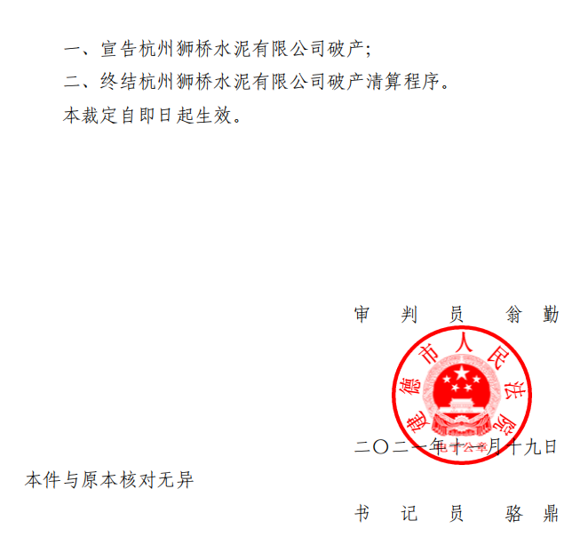 1月19日浙江省建德市人民法院發布《民事裁定書》稱,2021年8月26日,本院根據申請人浙江建德農村商業銀行股份有限公司大同支行的申請,裁定受理杭州獅橋水泥有限公司破產清算一案,并指定北京金杜(杭州)律師事務所擔任獅橋公司管理人。